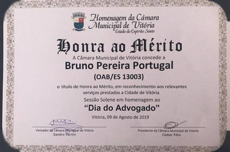 O sócio de DA LUZ ADVOGADOS, Bruno Portugal, foi homenageado no dia 09 de agosto de 2019 pela Câmara Municipal de Vitória, em Sessão Solene do “Dia do Advogado”, tendo recebido certificado com reconhecimento de relevantes serviços prestados a Cidade de Vitória.